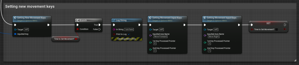 The main function for the options menu is to implement accessibility into the game. The way to implement this is to allow the player to set whatever key binding suits them. The main focus was to implement the changing of the movement keys. This is where I found out how different the changing of the bindings were for the axis mappings and the action mappings. This is where I dedicated my time in making the axis mappings for this week. The way this works is very complex so the most important things will be covered. The first image will show what happens when the player presses the movement button in order to change the keys: